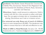 Ingredients: Shea Butter, Organic Apricot Kernel Oil, Organic Coconut Oil, Candelilla Wax, Arrowroot, Magnesium Salt, Jasmine Essential Oil, Distillates of Neroli, Rose, Geranium, Lavender and Tuberose.