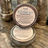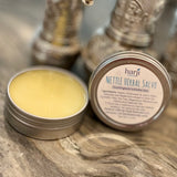 Ingredients**: Nettle, Chickweed, St. John's Wort, Calendula, Rose infused Olive Oil, Candelilla Wax, Tea Tree, Peppermint, Patchouli, and Helichrysum Essential Oils.