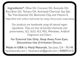 Ingredients: Saponified* Olive Oil, Organic Coconut Oil, Avocado Oil, Rice Bran Oil, Tamanu Oil, Activated Charcoal, Tea Tree Essential Oil, and Sea Salt.
