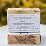 Ingredients: Saponified* Olive Oil, Coconut Oil, Shea Butter, Rice Bran Oil, Dark Patchouli Essential Oil, Red Brazilian Clay, Spinach Powder and Sea Salt.